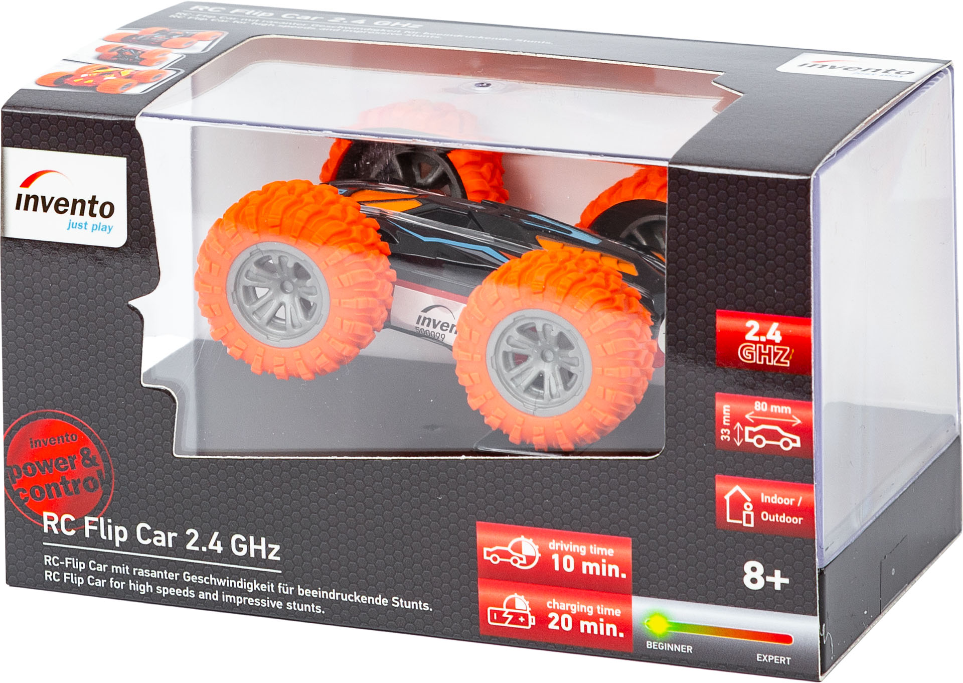 Contents: RC Flip Car with 2.4v 50mAh battery, remote controller, USB charging cable, instruction manual.