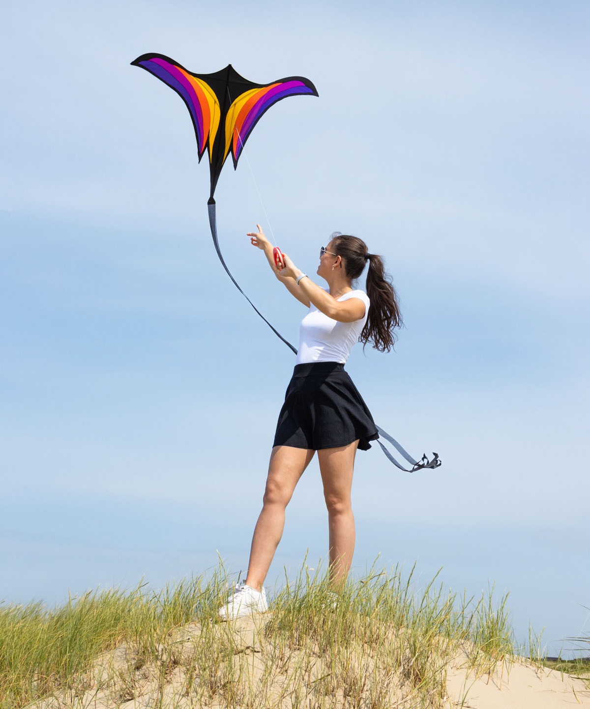 This impressive Delta kite, exclusively designed by Robert Brasington for Invento, combines top-tier craftsmanship with a distinctive design. With a generous wingspan of 6.5 ft. (200 cm) and an astonishing 16.5 ft. (500 cm) long organza tail, this kite offers a majestic flying experience like no other. The unique color scheme, makes this Delta kite stand out and creates a captivating spectacle in the sky. The combination of lightweight, durable materials and elegant lines gives the kite both stability and agility, making it an ideal flying companion in a wide range of wind conditions.
